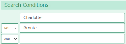 Materials including word "Bronte" are excluded though materials including word "Charlotte" are searched.