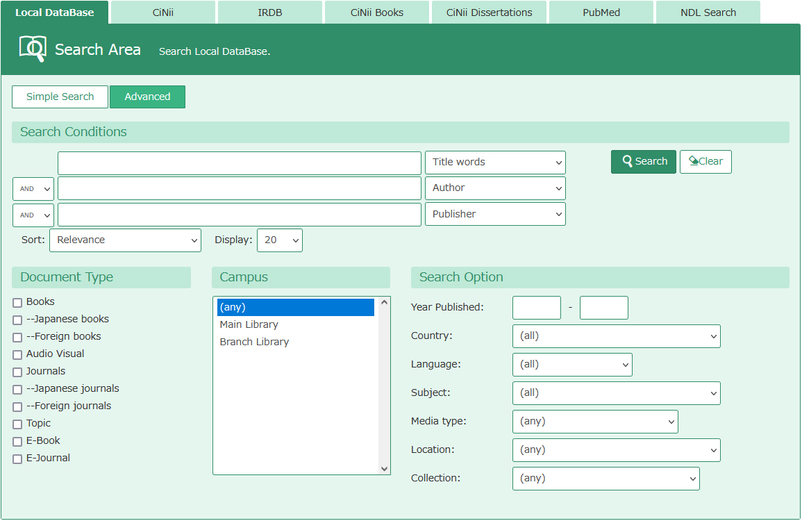 Local Database is the online catalog databases of academic materials (books, serials and audio visuals) in the collections of your university.